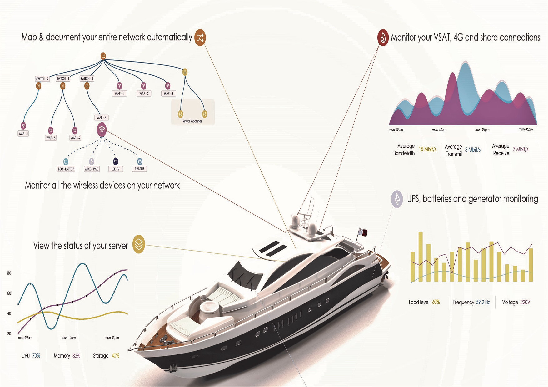 We strongly recommend our unique network monitoring tool to remotely manage the network and rapidly resolve issues with real-time network configuration backups. This is the most efficient way to manage on board network infrastructure, enabling us to quickly diagnose issues. To maintain a reliable connection, it’s important to keep network devices healthy and up-to-date. This easy to use, live monitoring tool provides complete efficient managed services and performance monitoring capabilities.